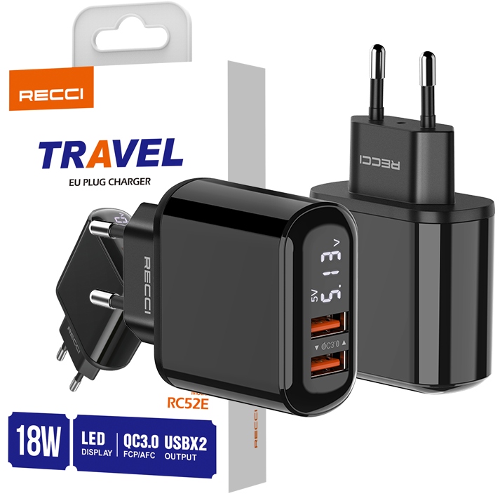 SZYBKA ŁADOWARKA SIECIOWA 18W 2x USB QC 3.0 ZASILACZ Z WYŚWIETLACZEM RECCI