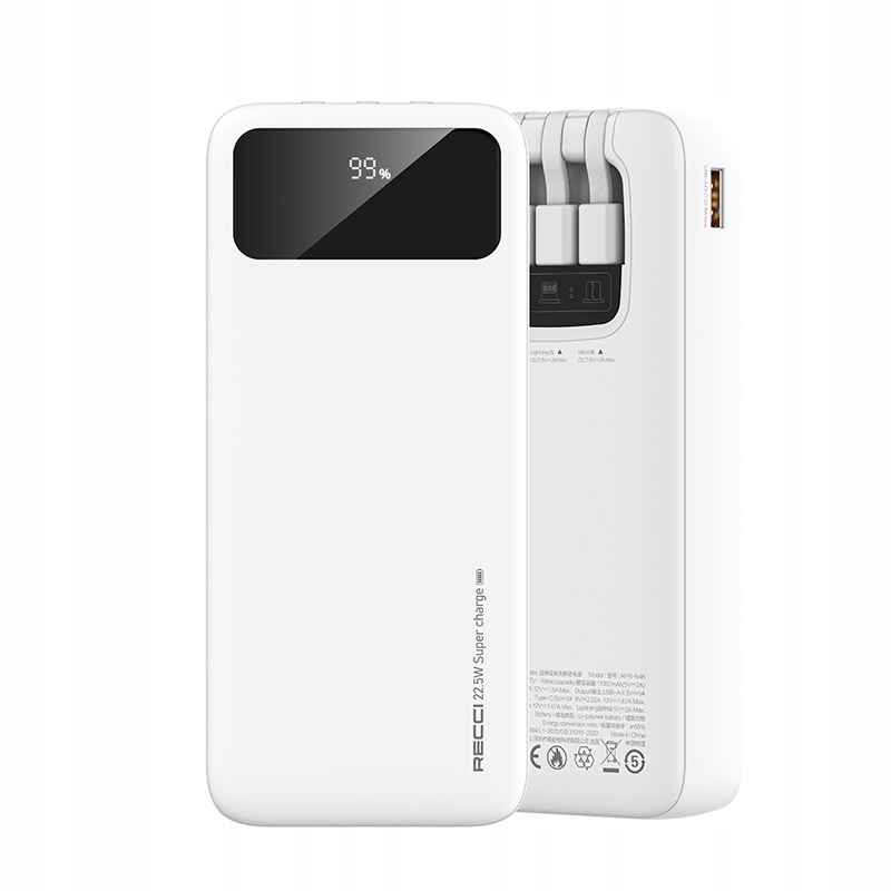 Powerbank RECCI został wyposażony w szybkie złącza dzięki czemu używanie Powerbanka stało się jeszcze bardziej wygodne. Dzięki wbudowanym kablom zapomnij o ich pilnowaniu w czasie podróży.